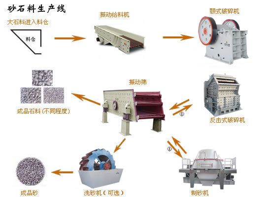 (1)、砂石生產線流程介紹石料由振動給料機均勻地送到顎式破碎機進行粗破,粗破后的物料由膠帶輸送機送入到制砂機進行進一步破碎,細碎后的物料被輸送到振動篩進行篩分,達到成品粒度要求的物料被送入洗砂機清洗,清洗后由成品輸送帶輸出即為成品;未達到成品粒度要求的物料從振動篩返回制砂機重新加工,形成閉路多次循環(huán)。成品粒度可按用戶的需求進行組合和分級。如果選用干法生產工藝,可配備粗細粉分離機和除塵設備。 (2)、砂石生產線性能介紹該制砂生產線自動化程度高,運行成本低,破碎率高,節(jié)能,產量大,污染少,維修簡便,生產出的機制砂符合國家建筑砂標準,產品粒度均勻,粒形好,級配合理。 砂石生產線(沙石生產線),沙石設備除了對設備的開機停機及日常維護之外,幾乎不需要人工操作。其生產效率高,運行成本低,產量大,收益高,成品石子粒度均勻、粒形好,符合國家高速用料要求。 砂石生產線,沙石設備在工藝流程的設計中,由于各級破碎設備匹配合理,以及嚴謹?shù)目臻g交叉布局,因此它具有占地面積小,投資經濟效益高,碎石料品質好,石粉產出率低等的特點為,同時配有先進的電控操作系統(tǒng),確保了整個流程出料通暢,運行可靠,操作方便,高效節(jié)能。 (3)、砂石生產線的特點:1.較為便捷的維護運行方式,相對于其他生產線設備設備維護保養(yǎng)簡便,易損件彩用目前國內最新高強耐磨材料,損耗小,使用壽命長,能為客戶帶來可觀的經濟效益! 2.全自動化的操作流程,生產效率更高、工作效率更優(yōu)化,自動化程度高,破碎比大,生產效率高,處理量大,經過破碎的產品呈立方體狀,針片狀含量低,無內裂縫,搞壓強度高。 3.應用范圍更廣成功應用于石灰石、玄武石、花崗巖、鵝卵石等巖石的破碎加工,破碎后的成品質量完全達到GB14685-2001標準,為高等公路、鐵路、水利、混凝土攪拌站等行業(yè)提供了合格骨料。 砂石生產線擴展閱讀